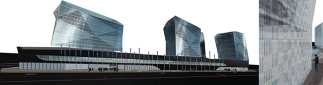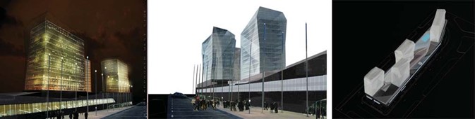 The design physically resembles Saudi Arabia’s desert dunes. A playful façade of triangular glass covered in wire mesh maintains the prismatic refraction effect found in the desert at day, and artfully pronounces the project at night. The sand dunes became a part of the artificial landscape created on the overall site and where used to define the zones of the three towers.