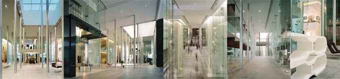 In the interior, the steel pillars are repeated to mark the paths between the glass cubes that have become boutiques for the world’s leading fashion brands: Gucci, Prada, Bottega Veneta, Salvatore Ferragamo, Fendi Etro, just to name a few, compose the sequence of spaces of this unusual, ultramodern high fashion marketplace. The furnishings of the restaurant and bar by B&B Italic, together with the pieces by Cappellini scattered in the connecting space in a discrete manner, indicate the taste of things Italian in this space fir elite shopping that rightfully assumes its place in the ranks of the new Gulf architecture.