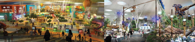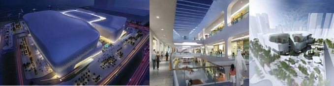 The design is inspired by the natural forms created when water and land meet. Five interconnected retail islands link the mall into the landscape and back to the water. A body of water running throughout the center of the scheme guides the visitor through the mall, leading to the marina. Internal waterfalls visually connect the different levels. The spaces between the five pebble-shaped islands are carefully landscaped, creating a series of green spaces.